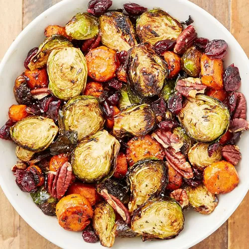 Preheat oven to 400°F. Scatter vegetables on a large baking sheet. Toss with oil, balsamic vinegar, rosemary, and thyme. Season with salt and pepper. Bake for 20 to 25 minutes, until the vegetables are tender, shaking the pan halfway through. Before serving, toss roasted vegetables with pecans and cranberries. In a large bowl, toss vegetables with oil, balsamic vinegar, and herbs. Season with salt and pepper. This dish is perfect as a vegetable side dish for the holiday season.